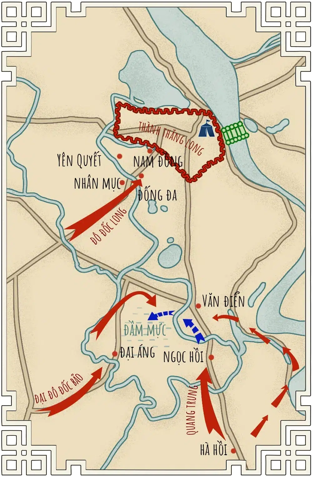 Hệ thống phòng ngự của quân Thanh ở phía Nam Thăng Long bị vỡ tan tành. Theo lời các giáo sĩ, hoàng đế Quang Trung đích thân cầm hai thanh đoản đao tham chiến. Trong trận này, một viên tướng là Đặng Văn Long muốn lập kỳ công, nên mặc áo trắng, lưng đeo cung, tay cầm trường kích xông vào đánh địch. Quang Trung từ xa trông thấy, sai người phi ngựa tới hỏi xem người áo trắng đó là ai, và gọi Đặng Văn Long tới diện kiến.